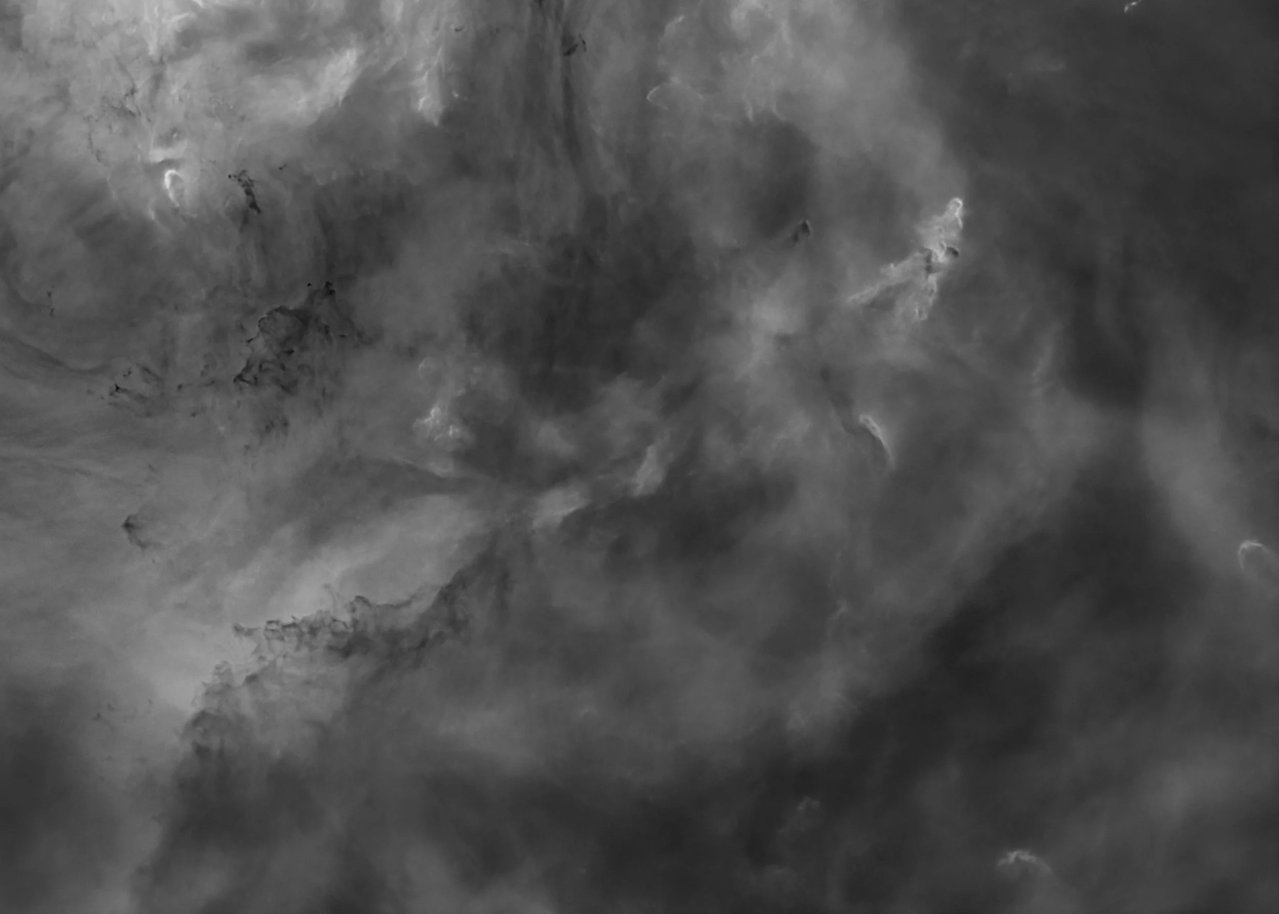 Dark absorption structures provide visual anchors while surrounding gas appears suspended across multiple layers, suggesting slow motion within the nebula. The image was processed with particular restraint to preserve tonal continuity and maintain the calm, immersive quality of the region.