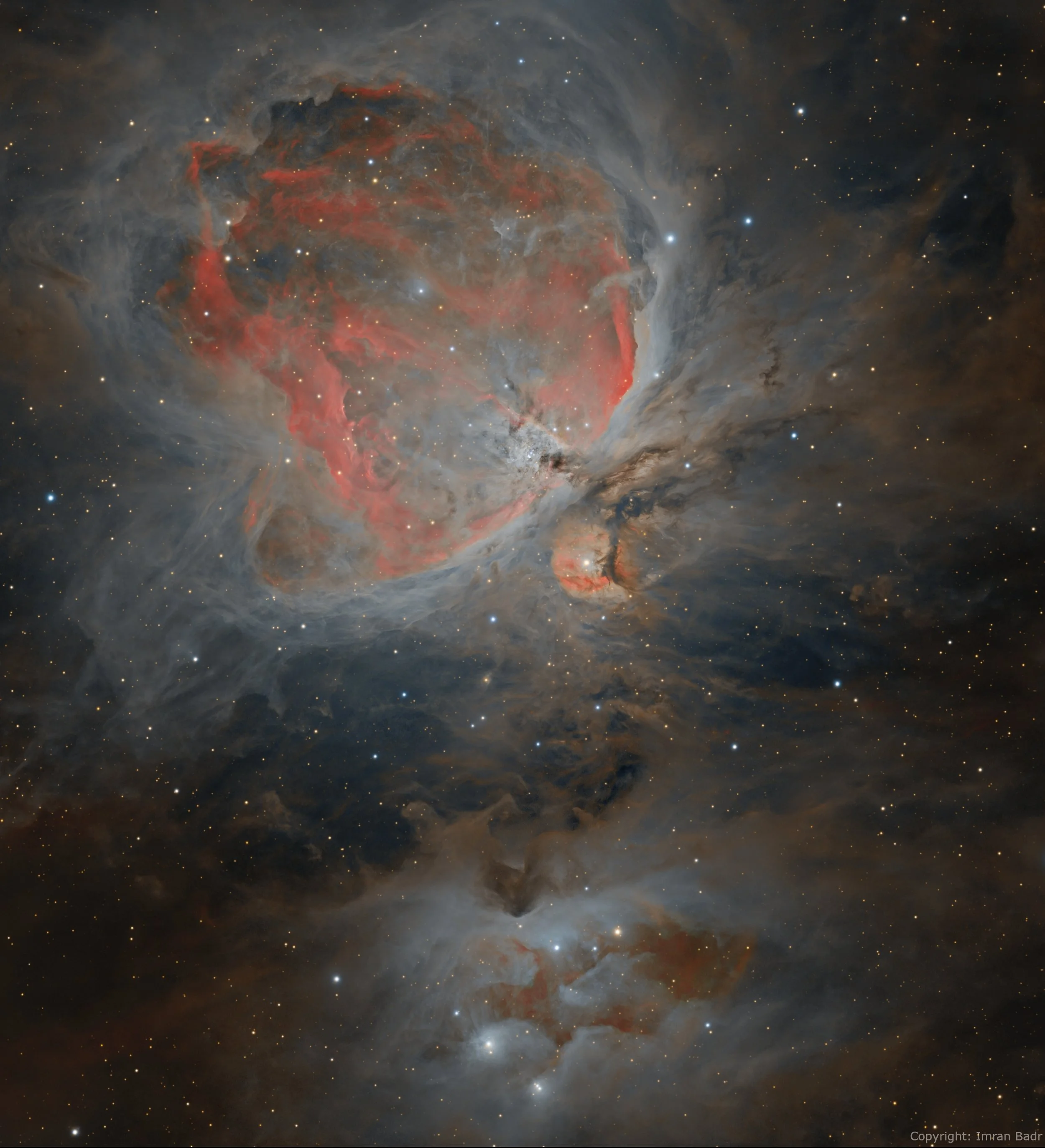 The Orion Nebula (M42) and the neighboring Running Man Nebula (NGC 1977) together form one of the most awe-inspiring regions in the night sky, located about 1,350 light-years away in the constellation Orion. The Orion Nebula is a massive stellar nursery where thousands of new stars are being born within glowing hydrogen clouds, while the Running Man reflects the light of nearby young, blue stars. Visible even to the naked eye, M42 has fascinated humans for millennia—ancient civilizations such as the Maya revered it as the “cosmic fire of creation,” believing it marked the birthplace of the stars. Modern astronomy confirms that this region, part of the larger Orion Molecular Cloud Complex, is indeed one of the most active sites of star formation in our galactic neighborhood, bridging ancient wonder with modern science.